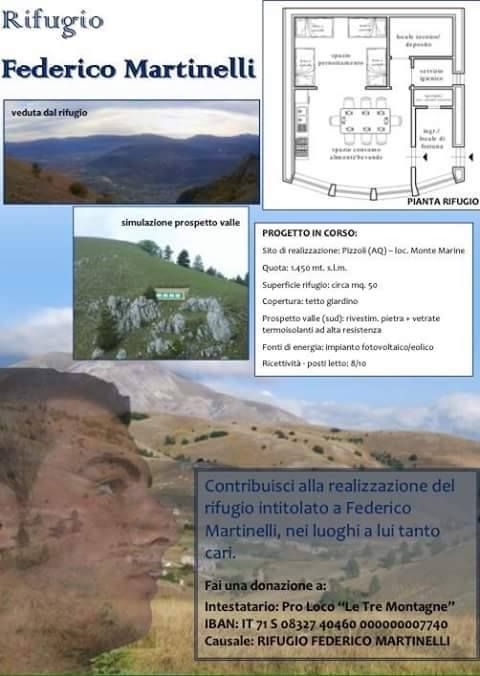 L’idea è quella di costruire il Rifugio su Monte Marine (che sovrasta l’abitato di Pizzoli) a 1450 metri di altezza, dove Federico era solito andare a fare passeggiate. Sarà grande circa 50 mq con rivestimento in pietra, vetrate termoisolanti ad alta resistenza, un tetto ricoperto d’erba per minimizzare gli impatti e con 8/10 posti letto.