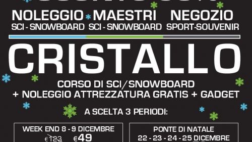 Maestri di Sci e Snowboard Cristallo, la scuola sci e noleggio con negozio sportivo annesso di Monte Bondone, lancia per il mese di dicembre una super promozione: lo sconto del 65% su un pacchetto che include il corso sci/snowboard collettivo di due ore, il noleggio dell’attrezzatura e un gadget. L'iscrizione è aperta a chiunque: adulti e bambini, sciatori e snowboarder, esperti e principianti (anche prima volta).