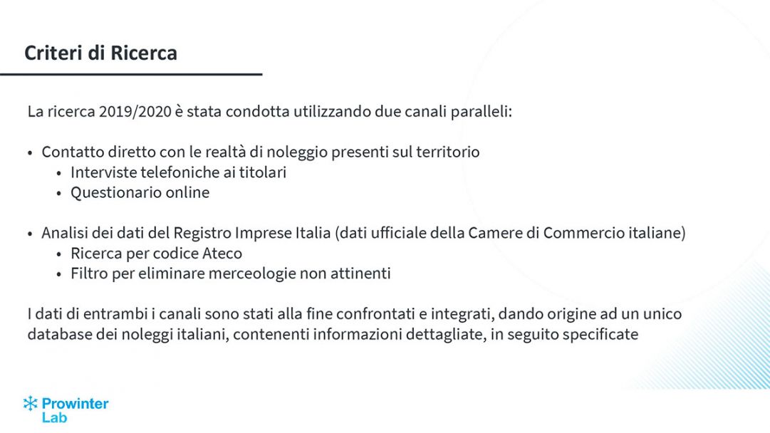 «Lo studio ha seguito due metodologie parallele – afferma Alfredo Tradati – Al contatto diretto con i noleggiatori abbiamo affiancato l’analisi dei dati ufficiali delle Camere di Commercio italiane, incrociandola con la ricerca per codice Ateco». I dati di entrambi i canali sono stati alla fine confrontati e integrati, dando origine ad un unico dettagliato
