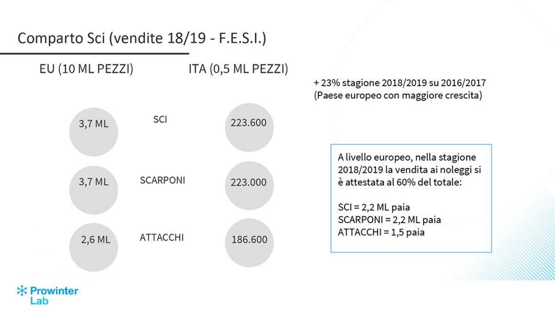 «Di particolare rilevanza è il dato che riguarda il numero di sci che vengono venduti dai produttori ai noleggiatori – analizza Tradati – Secondo i dati FESI (Federation of the European Sporting Goods Industry) sono 111.765 le paia di sci venduti ai noleggi italiani, pari al 50% delle vendite sci totali».