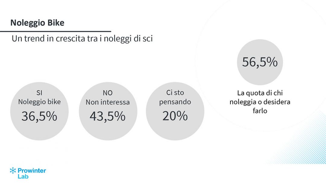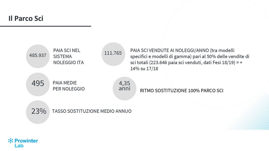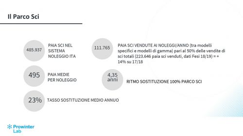 Benché la maggior parte dei centri noleggio offra ormai un’ampia gamma di prodotti per diverse discipline, sono lo sci alpino, lo snowboard e lo scialpinismo (sempre più in crescita) i settori più remunerativi per i noleggiatori. Dalle indagini condotte da Prowinter Lab emerge come ogni noleggio disponga, in media, di 495 paia di sci. Il 23% viene sostituito ogni anno.