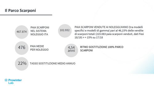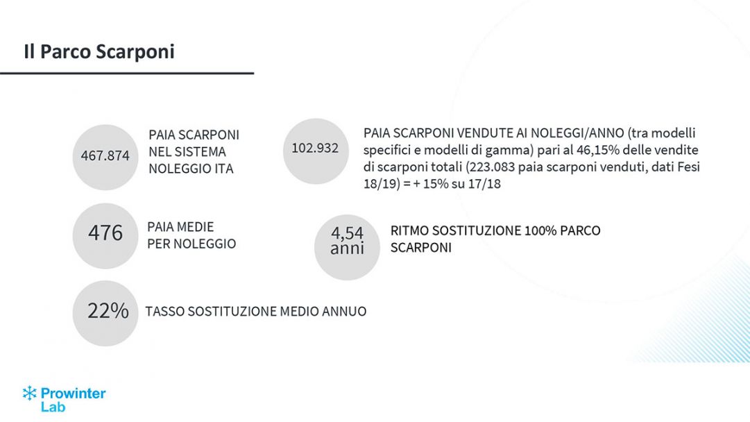 Alla luce delle ricerche di Prowinter Lab si stima che, rispetto al totale di sciatori presenti in pista, il 44,8% utilizza un servizio rental. Questi numeri, se confrontati con una spesa media pro capite pari a 60 euro, generano un volume d’affari complessivo intorno alla realtà del noleggio pari a 372 milioni di euro. Il pubblico dei noleggianti è composto al 70% da stranieri che utilizzano questo servizio per motivi di trasporto e perché culturalmente più abituati alla realtà del rental.