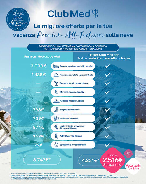 Nelle stazioni sciistiche più rinomate di Italia, Francia e Svizzera, sorgono i Resort Club Med che propongono pacchetti Premium All Inclusive per offrire una vacanza sulla neve al top.