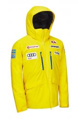 Il completo si caratterizza per un’imbottitura in Primaloft 100gr sul torso e 80gr sulle braccia. La particolarità del Primaloft utilizzato da Goldwin consiste in un trattamento esclusivo con piccole particelle di ceramica denominato KODENSHI, che contribuisce a riflettere il calore del corpo e mantenere lo sciatore più a lungo al caldo. Viene proposta quest’anno una nuova tasca con un supporto per smartphone felpato e realizzato in un materiale che tiene al caldo il cellulare, conservando meglio la batteria. Anche il cappuccio, “Stable Shape Hood”, è nuovo: è dotato di una coulisse interna snodata che va dalla parte posteriore del cappuccio fino a quella anteriore e permette di regolare simultaneamente sia il volume che il profilo. Questo accorgimento permette di avere il profilo del cappuccio molto più comodo, sia con il casco che con la maschera.