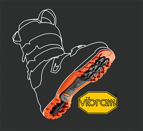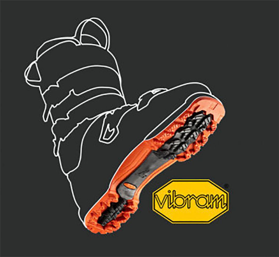 La suola touring fully rocker conforme a ISO 9523 in Vibram® garantisce un'aderenza straordinaria sui terreni più difficili mentre il battistrada aggressivo assicura un'ottima tenuta sulla neve quando si affrontano ripide ascese in boot-packing. Il profilo rocker della suola consente una falcata assolutamente naturale e priva di sforzo.