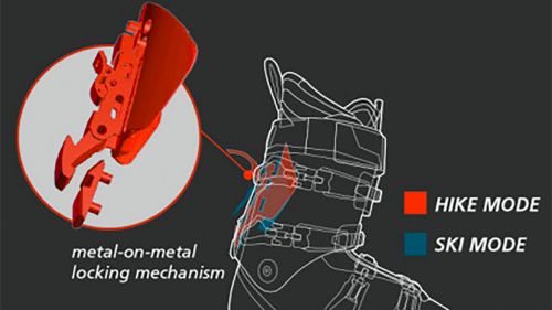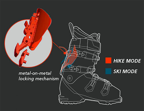La solidità in discesa è fuori questione: oltre al know-how Lange e alla tecnologia di coiniezione brevettata Dual Core è stato addottato il sistema ski/walk Active Power V-Lock in metallo che aveva costituito il punto di forza della linea XT3 da Freeride. Una volta inserita la modalità Ski, gli scarponi garantiscono un contatto solidissimo tipico di uno scarpone da discesa tradizionale, offrendo la trasmissione della potenza, precisione e controllo caratteristici del marchio Lange. L'indice di flex arriva a 130!