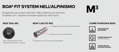 Con 11 anni di esperienza nell’alpinismo, BOA® Fit System si è affermato negli scarponi da sci alpinismo di fascia alta – dagli scarponi da gara super leggeri in carbonio ai modelli progettati per le salite o le discese, fino agli scarponi adatti a più occasioni. BOA® Fit System offre un fit preciso e regolabile per migliorare la reattività e il controllo