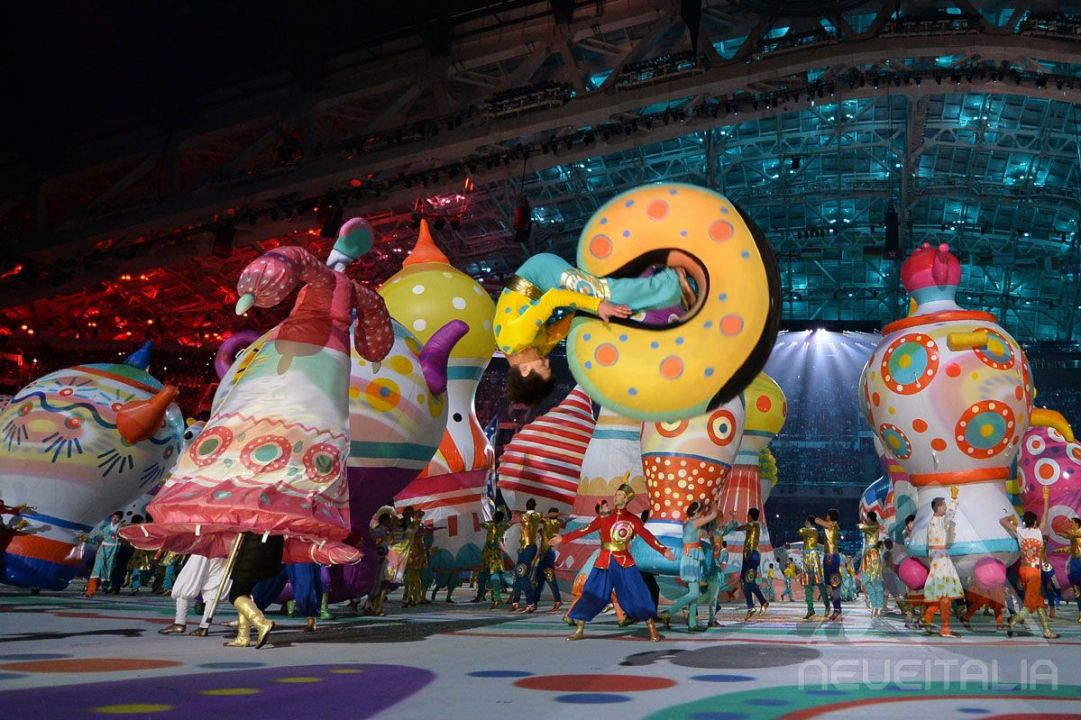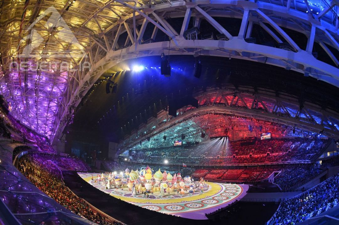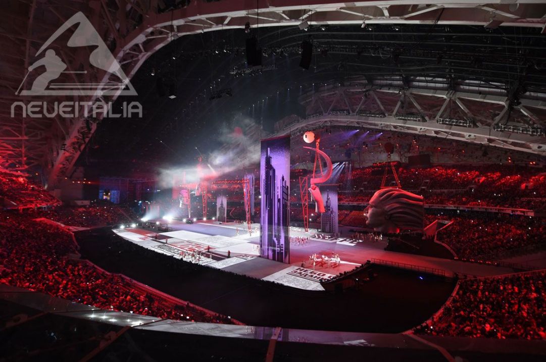 Il Fisht Olympic Stadium è il teatro del primo atto ufficiale delle ventiduesime Olimpiadi Invernali di Sochi, la cerimonia d’apertura, che inizia alle 20,14 (in assonanza con l’anno in corso) ora locale, le 17,14 ora italiana. Si comincia con la carrellata delle lettere dell’alfabeto russo, ciascuna associata a un fatto o a un personaggio della storia della Russia. Una ragazzina di 11 anni, che ha sognato queste lettere e questi fatti e personaggi viene sollevata da terra da un aquilone e vede passare idealmente tutti i paesaggi di questa immensa nazione. Piccolo intoppo quando uno dei cinque cerchi olimpici non si espande rimanendo mestamente chiuso. Segue l’inno russo con decine di persone illuminate di blu, rosso e bianco, i colori della bandiera russa.