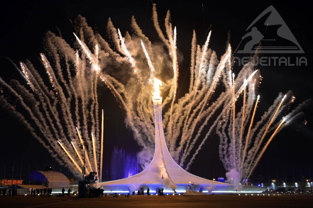 Bella la coreografia con decine di pattinatori ed effetti speciali che simboleggiano i vari sport olimpici invernali. Arriva il momento dell'accensione del tripode. La fiamma olimpica entra nello stadio portata dalla tennista Maria Sharapova, via via la torcia passa nelle mani dell'astista Elena Isinbayeva, dell'olimpionico di lotta greco-romana Alexander Karelin e della ginnasta della ritmica Alina Kabaeva, quindi passa nelle mani dell'ultimo tedoforo che... sono due, entrambi tre volte campioni olimpici invernali! Si tratta infatti di Irina Rodnina, leggendaria pattinatrice di figura nelle coppie dell'artistico, e di Vladislav Tretiak, uno dei goalie più grandi di sempre dell'hockey su ghiaccio, i due accendono insieme il braciere che risplenderà sul mondo degli sport invernali, e non solo, per i prossimi 16 giorni.