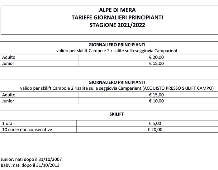Skipass Principianti Alpe di Mera 2021/2022