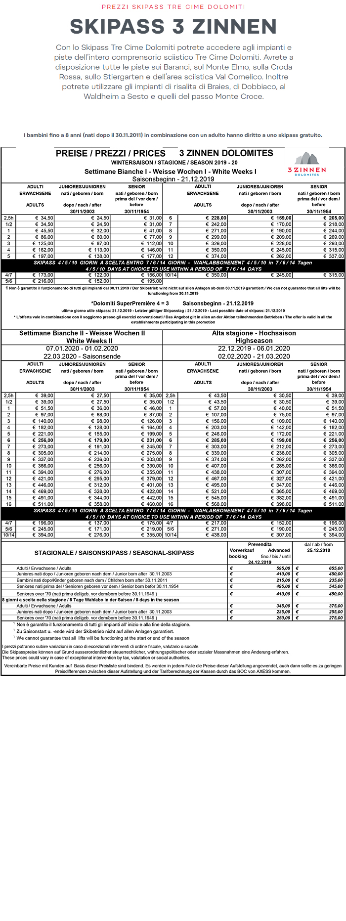 Skipass Tre Cime Alta Pusteria 2019/2020