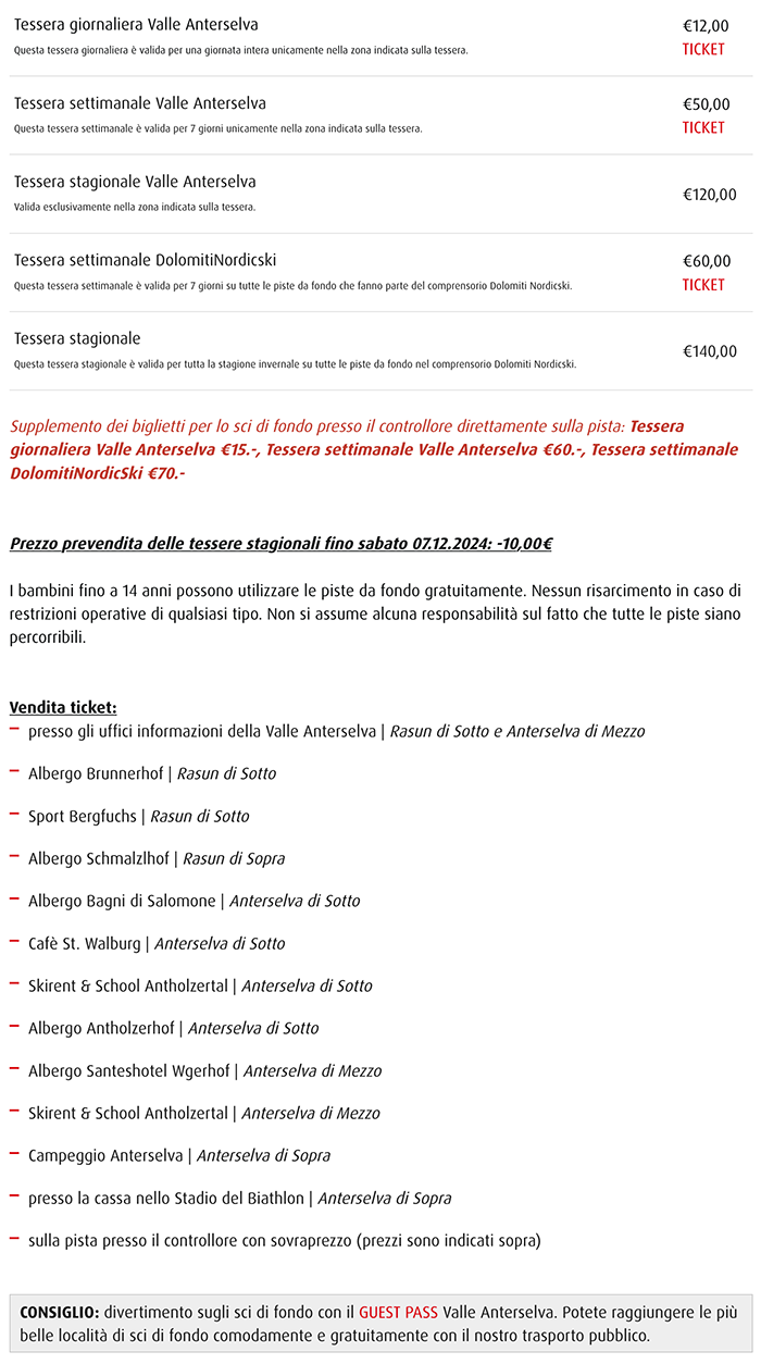 Tariffe sci di fondo Valle Anterselva 2024/2025
