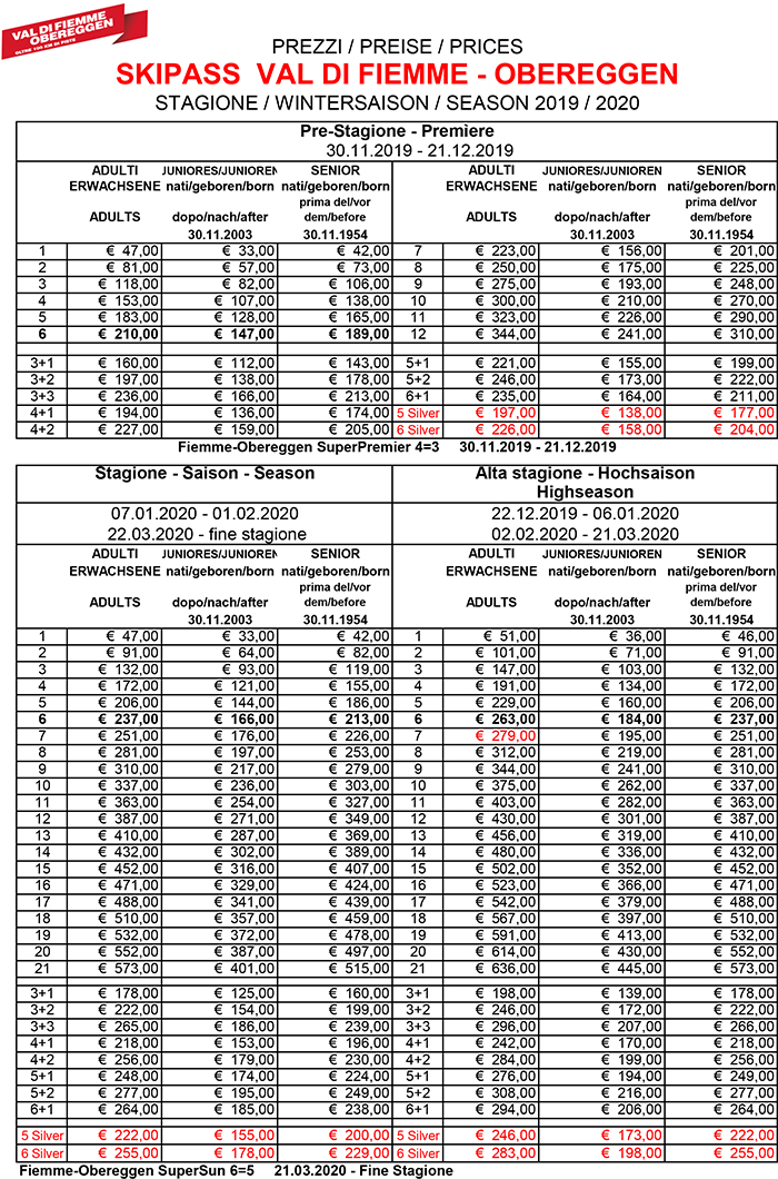 Skipass Cavalese Fiemme Obereggen 2019/2020