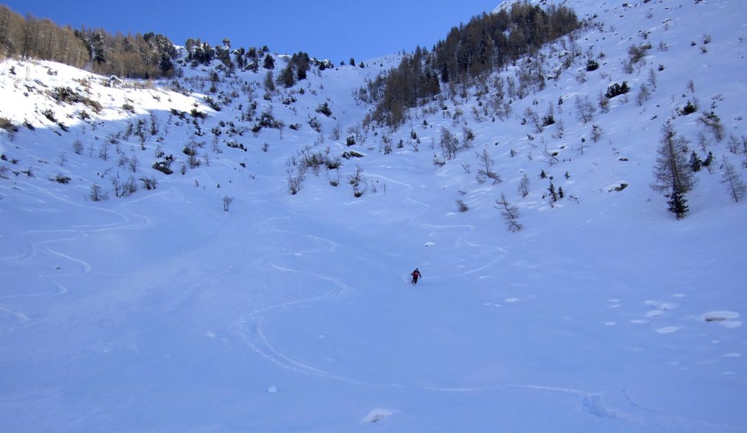 Dopo le opportune valutazioni, vista l’esposizione della zona ai piedi della Punta Fenilia di 3.053 metri che domina la valle, si inizia la discesa freeride prima in un bosco rado per giungere ad una parte più ampia e libera rientrando poi nell’ultima parte in una zona con tronchi e pietre che termina sulla strada che porta verso la splendida Valnontey.