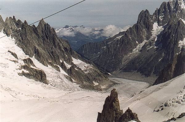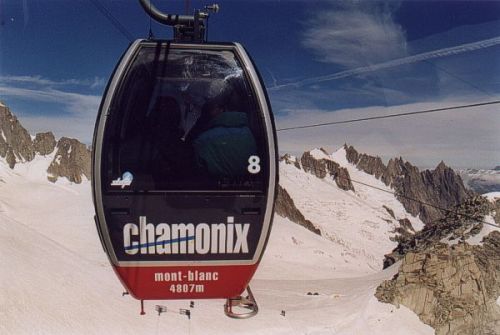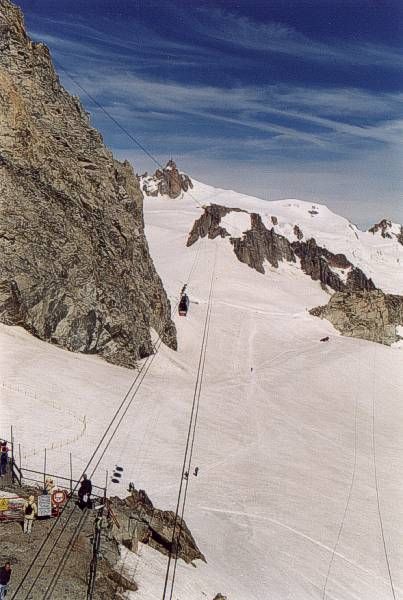Gros Rognon Prima di risalire sulla funivia, ammiriamo in direzione della Francia il percorso, col pilone sospeso, il passaggio sul Gros Rognon (con cambiamento del cavo portante nonchè leggera deviazione) e in fondo la sagoma dell'Aiguille du Midi.