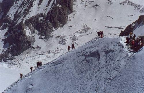 cima del bianco Un'immagine ravvicinata (con un 200 mm.) della cima. Piccolissimi, parecchi alpinisti salgono a destra del Mont Maudit (4465 m.) verso il Bianco. Si vede il loro percorso zigzagare fino alla cima.