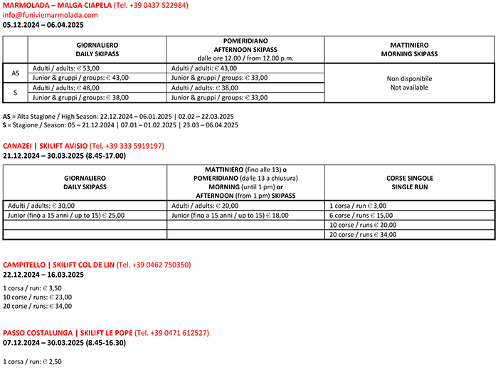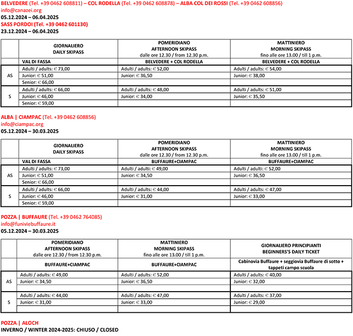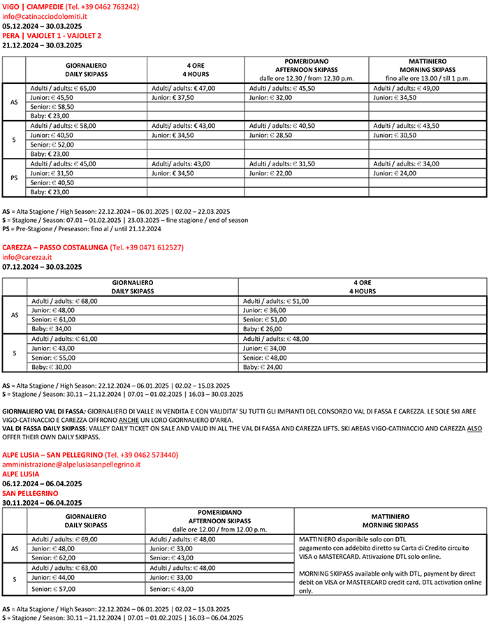 Tariffe impianti Val di Fassa - Carezza 2024/2025