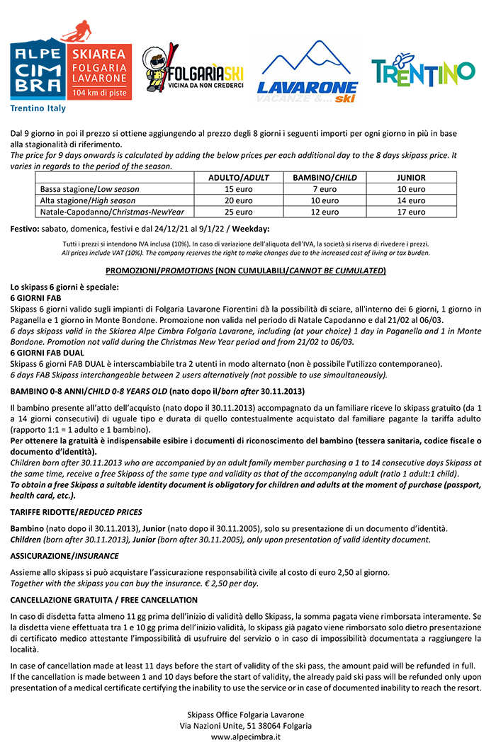 Skipass Folgaria Lavarone Fiorentini 2021/2022