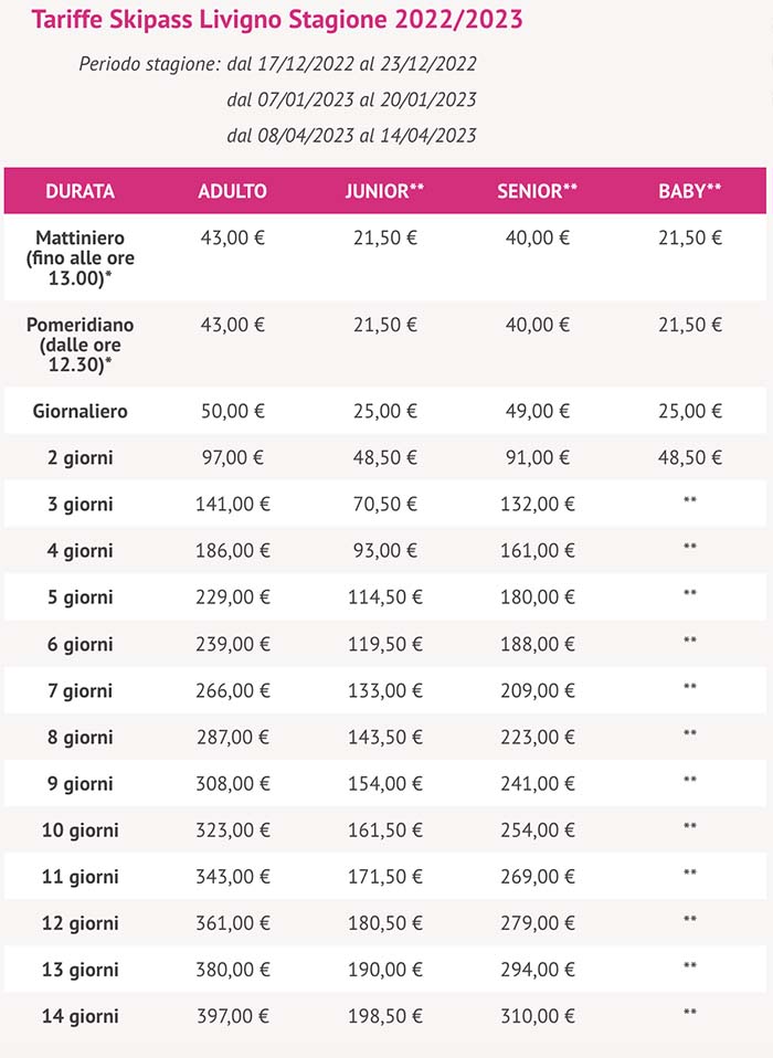 Tariffe Skipass a punti e Stagionali Livigno 2022/2023
