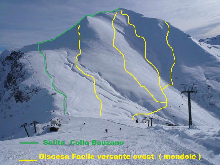 Per finire l'ultima opzione di discesa il versante ovest quello più battuto dagli alpinisti per discendere, in quanto il più facile, che arriva dove siamo partiti a Colla Bauzano 1951 mt. Slm. in prossimità della seggiovia Mondolè e della sciovia Cima Duran.