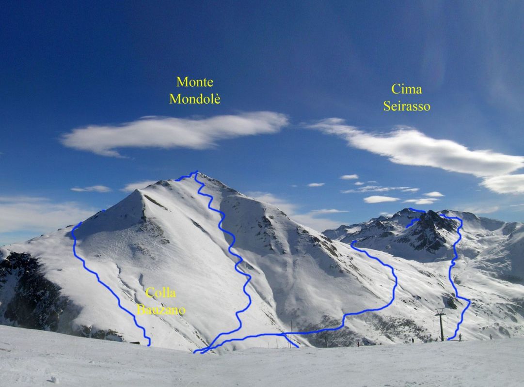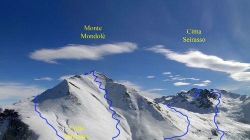 Da Artesina prendiamo la seggiovia quadriposto Mirafiori, in seguito la seggiovia a due posti Mondolè che ci porterà in prossimità di Colla Bauzano 1951 mt. Slm, da qui messe le pelli agli sci cominciamo la nostra salita che nella parte iniziale sarà battuta dal gatto delle nevi usato dalla stazione per bonificare i versanti che danno sulle piste da sci.