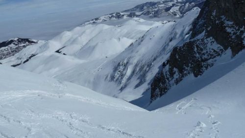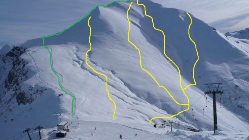 Le opzioni di discesa sono molte: Verso la Balma molto esposto al sole e a sud, consigliato durante la primavera quando si scia sul Firn. Il Canale degli Ippopotami bello tutto l'anno perchè poco esposto al sole e dove si arriva in prossimità del Lago delle Scalette 1860 mt. Slm. e della sciovia Rocche Giardina. La parete Nord della gara di Freeride a cui ho accennato prima, bella tutto l'anno e dove si può trovare quasi sempre la powder, che arriva in prossimità della partenza delle sciovie Pogliola e Rocche Giardina 1601 mt. Slm.