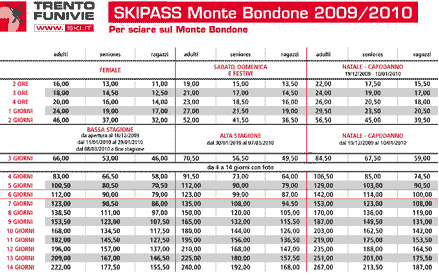 PREZZI SKIPASS MONTE BONDONE 2009/2010