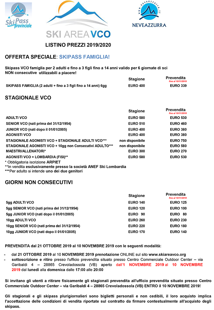 Skipass STAGIONALE VCO Verbano Cusio Ossola 2019/2020