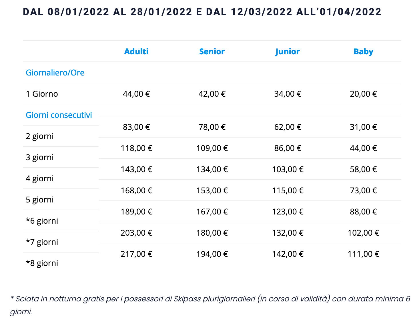 Prezzi Skipass