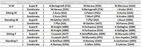 Nella categoria Standing il campione paralimpico di Combinata, Markus Salcher, e lo svizzero Thomas Pfyl si dividono gli onori. L'austriaco vince il SuperG e chiude al secondo posto in Combinata dove si impone il rossocrociato, secondo sabato quando l'olandese Jeffrey Stuut, terzo, ha ottenuto il primo podio di Coppa del Mondo della carriera. Terzo in Combinata lo slovacco Martin France.