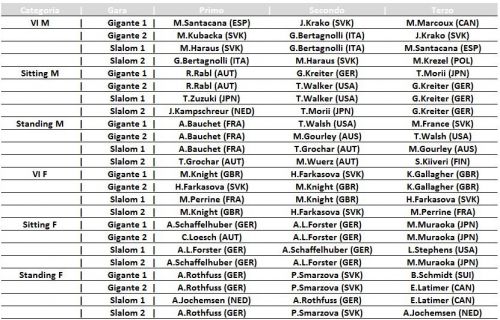 Ancora una tappa dominata da Andrea Rothfuss, campionessa di Sochi in Slalom, nella categoria Standing; la tedesca vince i due Giganti e il secondo Slalom dopo aver chiuso al secondo posto la prima gara tra i pali stretti vinta dalla olandese Anna Jochemsen. Continua la marcia di riavvicinamento al vertice di Melania Corradini che chiude al quinto e al sesto posto i due Giganti.