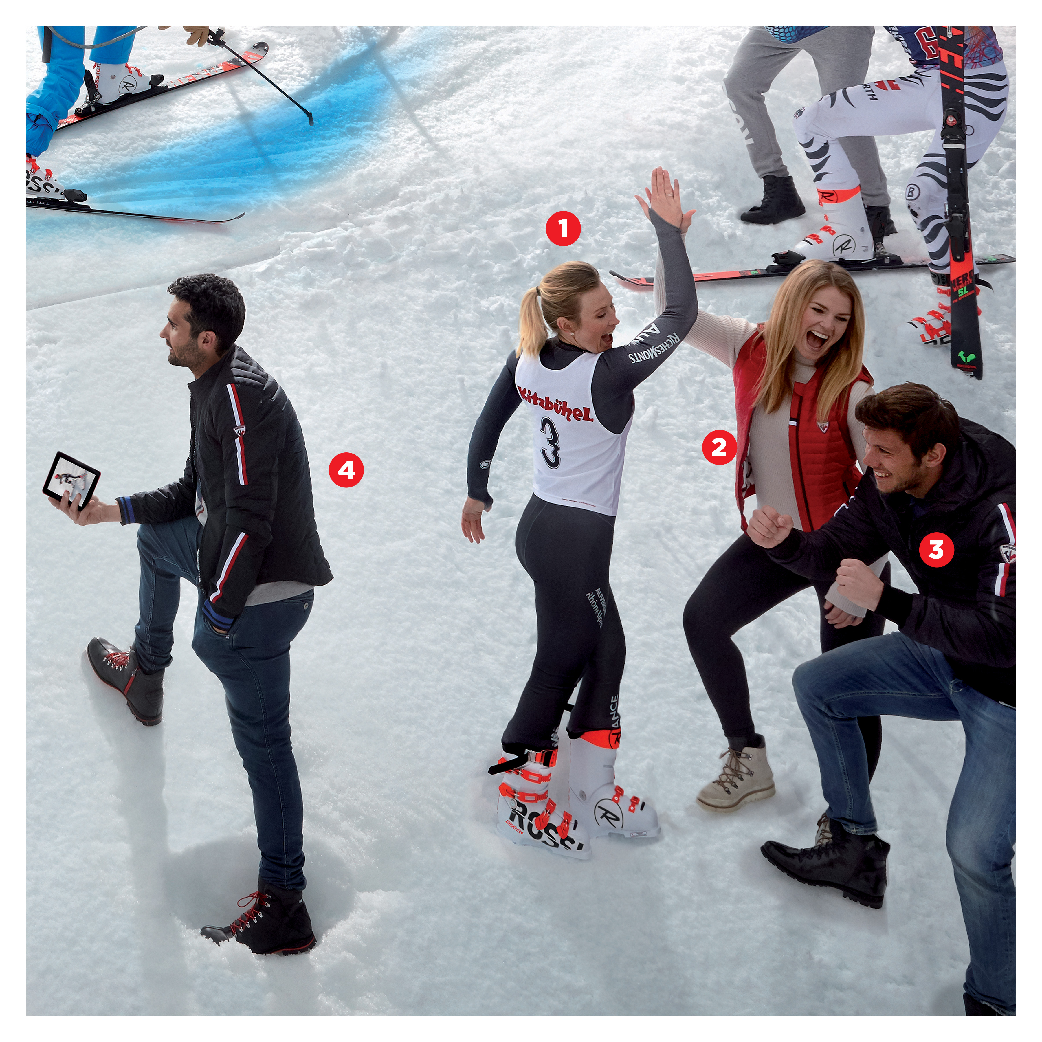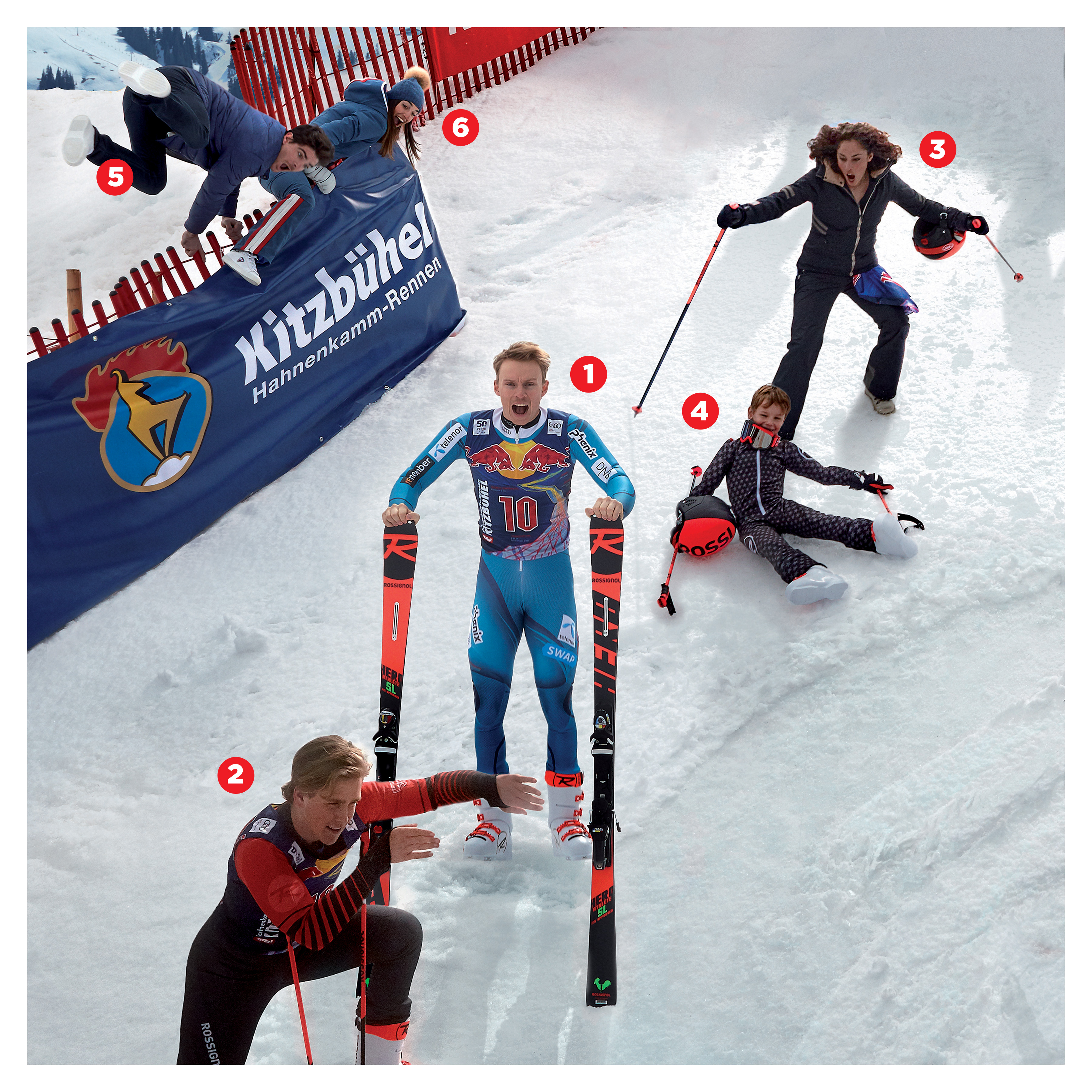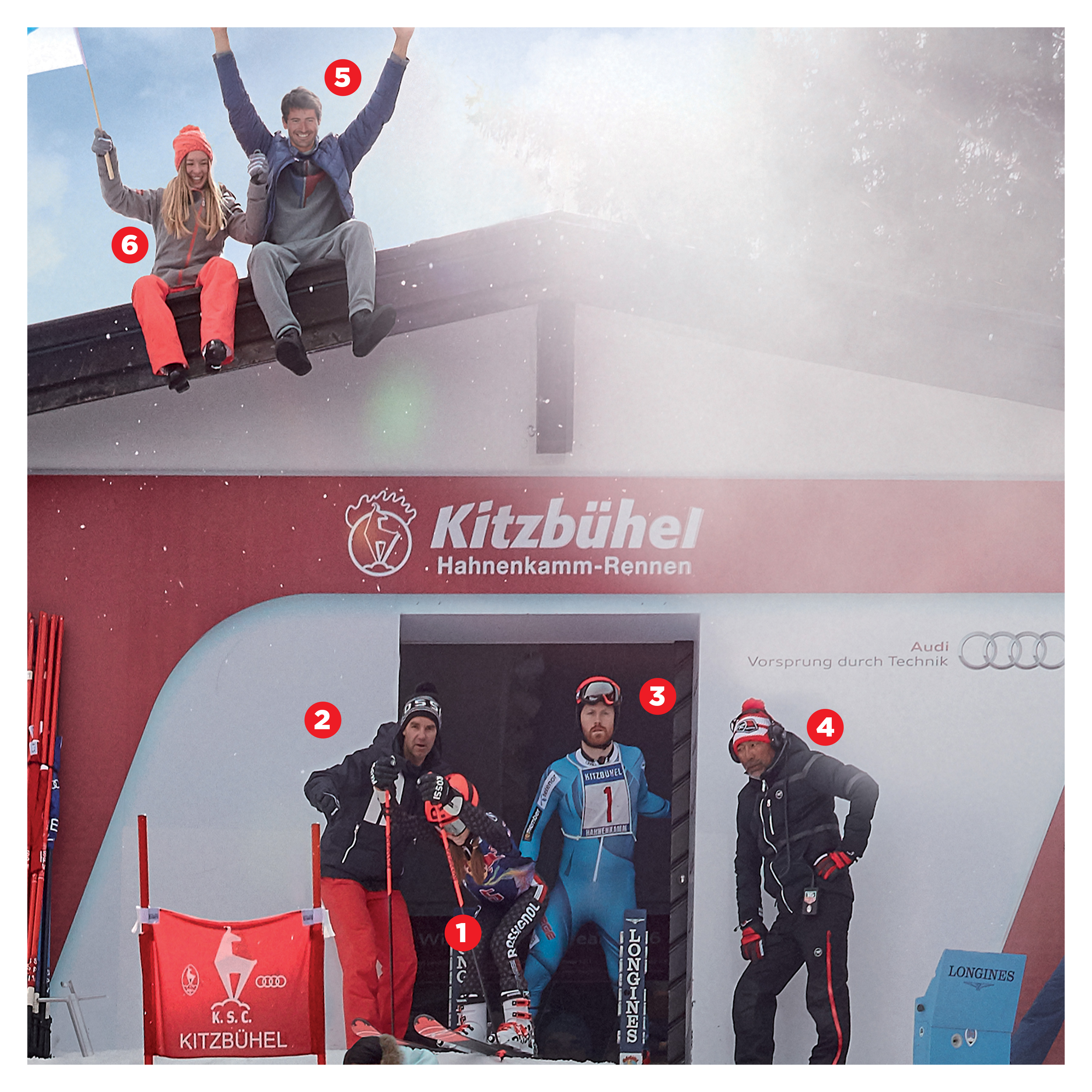 Al centro dell'immagine un entusiasta Henrik Kristoffersen (1). Dopo aver vinto lo Slalom 2016 e concluso secondo nel 2014 a Kitzbühel, il norvegese sta riflettendo con orgoglio su questi risultati tenendo d'occhio il giovane prodigio americano River Radamus (2), che ha appena vinto l'argento nei campionati del Mondo Junior. Dietro di lui, Federica Brignone (3), quinta nella classifica generale ai Mondiali del 2017, si gode il ronzio generale di uno dei giovani sciatori del Kitzbühel Ski Club, Felix Hofer (4). Più a sinistra, non si fermano i due freestyler Ben Valentin (5), secondo nella Half-Pipe World Cup, e Perrine Laffont (6), campione del mondo di Moguls, che non vede l'ora di mettere piede sulla leggendaria, temibile Streif!