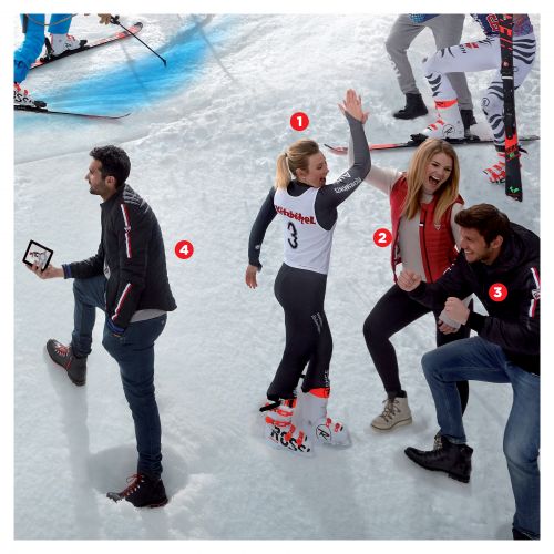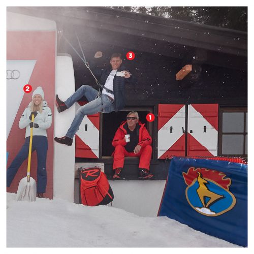 La casetta alla partenza della Streif. La giovane austriaca Lena Schwarzenauer (1) è pronta a saltare fuori dal cancello di partenza. Alla sua destra, Didier Defago (2), uno dei vincitori della discesa libera a Kitzbühel e campione olimpico nel 2010, ha la mano sulla spalla mentre le dà alcune istruzioni finali. Dietro di lei, Leif Kristian Haugen (3), che ha recentemente vinto la sua prima medaglia internazionale in Slalom Gigante, sta guardando da vicino, pronto a rallegrare Lena quando l'apripista Naomine Iwaya (4), medaglia d'oro ai Giochi asiatici del 1986, comincerà a solcare la pista. Sul tetto, Jean-Baptiste Grange (5), un doppio campione del mondo nello Slalom che è recentemente tornato a Rossignol, si sta godendo il momento accanto alla promettente sciatrice svizzera Lara Baumann (6).