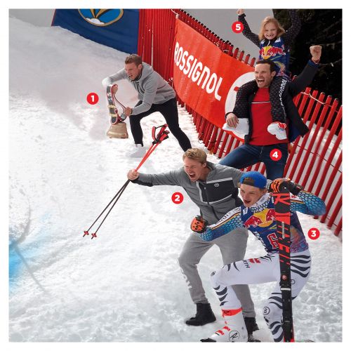 Gli appassionati Svizzeri del circo bianco apprezzeranno questa scena. I tre membri tedeschi del Team Rossignol stanno dando il massimo faceno il tifo per i giovani corridori del Kitzbühel Ski Club. Il campione del mondo di Biathlon Simon Schempp (1) sta suonando un campanello per tutto il valore che c'è sotto di lui, con Stefan Luitz (2) e Linus Strasser (3) - con cinque podi della Coppa del Mondo - che non riescono a contenere il loro entusiasmo. Dietro di loro, l'esperto Christof Innerhofer (4), secondo nella discesa di Kitzbühel nel 2017, sta incoraggiando la ragazza locale Emma Hofer (5) sulle sue spalle.