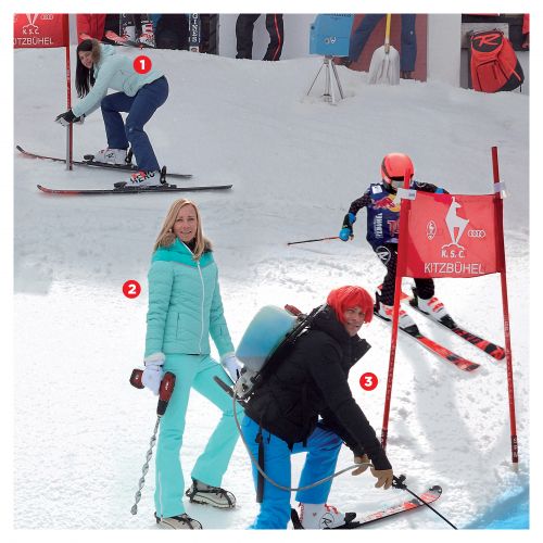 Un giovane sciatore del Kitzbühel Ski Club è appena sceso, quindi ora la pista deve essere pulita! La due volte campionessa del mondo junior Nadine Fest (1) si sta facendo strada mentre il vincitore della Coppa del Mondo 2016 Frida Hansdotter (2) sta sistemando il prossimo con la sua esercitazione con il campione olimpico del 1998 Hans Petter Buraas (3) che guarda divertito. Per l'occasione, ha lo stesso colore dei capelli di allora!