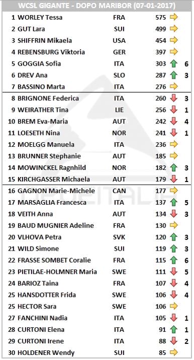 Grazie agli eccellenti risultati delle ultime prove, entra in primo gruppo la norvegese Ragnhild Movinckel mentre ne esce Anna Veith ancora alla ricerca della migliore condizione; si avvicina alle prime quindici, formalmente a due posizioni nella realtà solo a una la regolare Francesca Marsaglia.