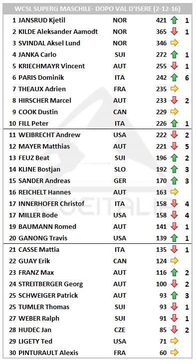 I criteri di assegnazione dei pettorali per le discipline veloci prevedono, infatti, in questa stagione la creazione di tre gruppi di 10 atleti di fatto. Il primo gruppo, coloro che nella World Cup Starting List occupano le prime dieci posizioni, scelgono il loro numero di partenza tra quelli dispari tra l'1 e il 19. Terzo a Val d'Isere, Dominik Paris recupera sei posizioni e occupa ora il sesto posto nella WCSL e in Val Gardena sarà il sesto a scegliere il pettorale. Entra nei dieci anche Peter Fill anche se il decimo posto è forse il più sfavorito dall'attuale regolamento dovendo prendere l'unico numero dispari non scelto e non avendo la possibilità che hanno gli atleti del secondo gruppo di avere un sorteggio più favorevole. A fare spazio ai due italiani nei primi dieci sono Andrew Weibrecht and Matthias Mayer.