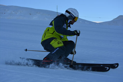 L’ingresso curva è particolare, è l’aspetto che più è cambiato oltre alla rigidità della struttura. L’impulso è minore e l’ingresso è meno diretto del modello precedente, “richiede una buona energia per sfruttarlo appieno” (Giordano Magri) ma durante la prosecuzione di curva si apprezza “la continuità di deformazione e la risposta elastica: lo senti morbido ma allo stesso tempo attaccato a terra” chiude l’istruttore Stefano Belingheri, che promuove a pieni voti gli sforzi dei tecnici Head.