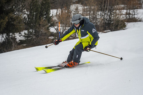 La dotazione viene completata alla perfezione, oltre che dalla costruzione 3D.Glass, dai due strati di Titanal su tutto lo sci e dalla collaudata anima in legno multistrato, anche dal nuovo attacco R-Motion 3 GW. La piastra accorciata in combinazione con uno schema di foratura più ampio consente una trasmissione dell’energia più diretta e più potente e permette cambi di spigolo più rapidi. Il clou è però rappresentato dalle due viti posteriori che non sono più fissate e che consentono quindi all’attacco di scorrere liberamente, permettendo allo sci di muoversi armoniosamente su tutta la linea di piegatura senza venire bloccato e con una migliore presa di spigolo.
