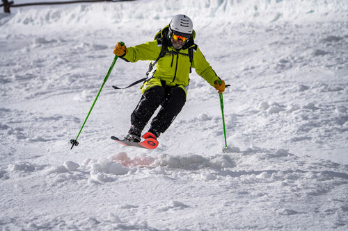 Può essere montato anche con un set-up da ski Touring per usarlo in gite di ski Touring con l'ausilio delle pelli sintetiche per ascese non troppo lunghe e impegnative.