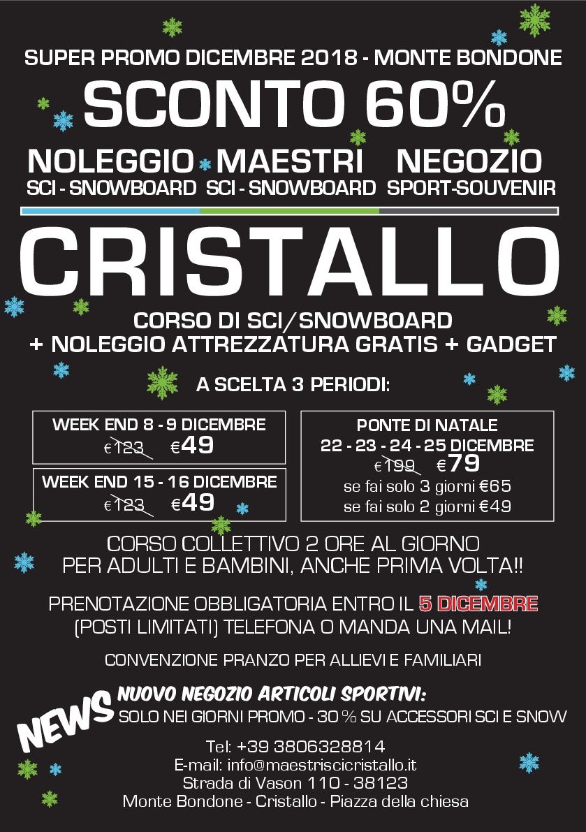 Maestri di Sci e Snowboard Cristallo, la scuola sci e noleggio con negozio sportivo annesso di Monte Bondone, lancia per il mese di dicembre una super promozione: lo sconto del 65% su un pacchetto che include il corso sci/snowboard collettivo di due ore, il noleggio dell’attrezzatura e un gadget. L'iscrizione è aperta a chiunque: adulti e bambini, sciatori e snowboarder, esperti e principianti (anche prima volta).
