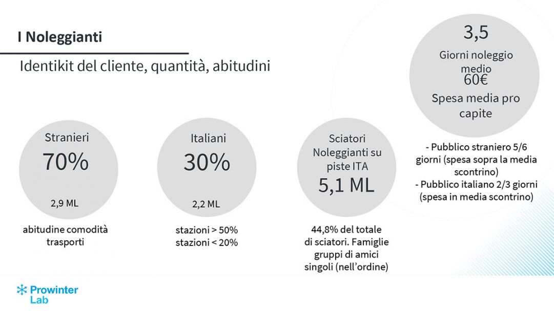 Alla luce delle ricerche di Prowinter Lab si stima che, rispetto al totale di sciatori presenti in pista, il 44,8% utilizza un servizio rental. Questi numeri, se confrontati con una spesa media pro capite pari a 60 euro, generano un volume d’affari complessivo intorno alla realtà del noleggio pari a 372 milioni di euro. Il pubblico dei noleggianti è composto al 70% da stranieri che utilizzano questo servizio per motivi di trasporto e perché culturalmente più abituati alla realtà del rental.