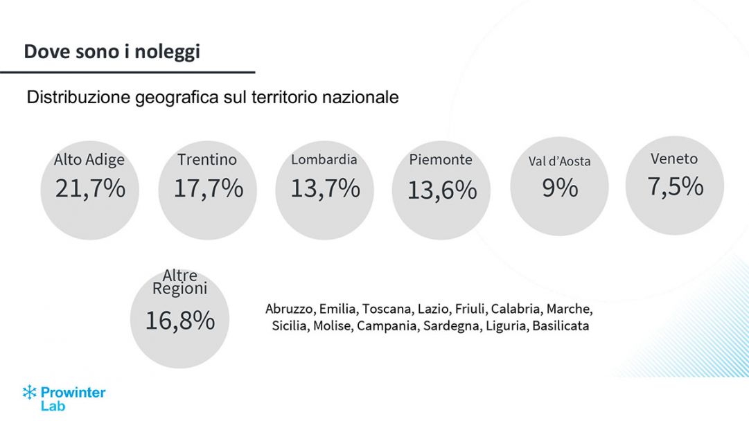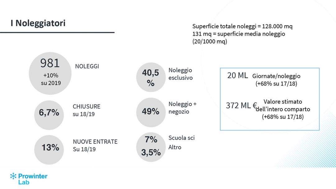 Sono 981 i noleggi “censiti” da Prowinter Lab, numero che comprende tutte le strutture di rental, anche quelle che non affittano esclusivamente attrezzatura per discipline invernali.