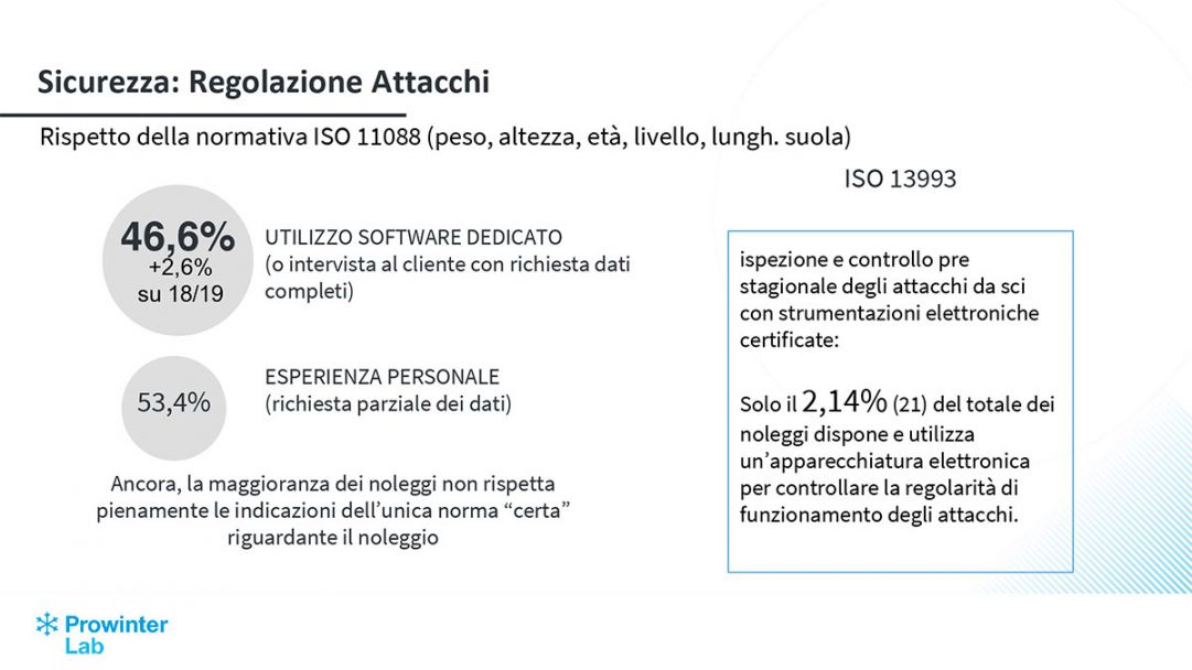 Dal lavoro condotto da Prowinter Lab, tuttavia, emerge come la maggioranza dei noleggi non rispetti pienamente le indicazioni dell'unica norma “certa” riguardante il noleggio. Infatti, solo il 46,6% dei noleggiatori si avvale di software specializzati per la regolamentazione ISO 11088, mentre il restante 53,4% si basa sulla propria esperienza. Riguardo alla norma ISO 13993 i dati sono ancora più preoccupanti: stando alle indagini solo il 2,14% del totale dei noleggi dispone e utilizza un’apparecchiatura elettronica per controllare la regolarità di funzionamento degli attacchi.