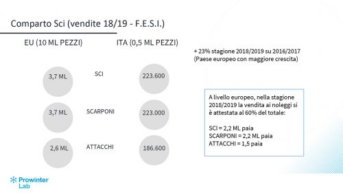«Di particolare rilevanza è il dato che riguarda il numero di sci che vengono venduti dai produttori ai noleggiatori – analizza Tradati – Secondo i dati FESI (Federation of the European Sporting Goods Industry) sono 111.765 le paia di sci venduti ai noleggi italiani, pari al 50% delle vendite sci totali».