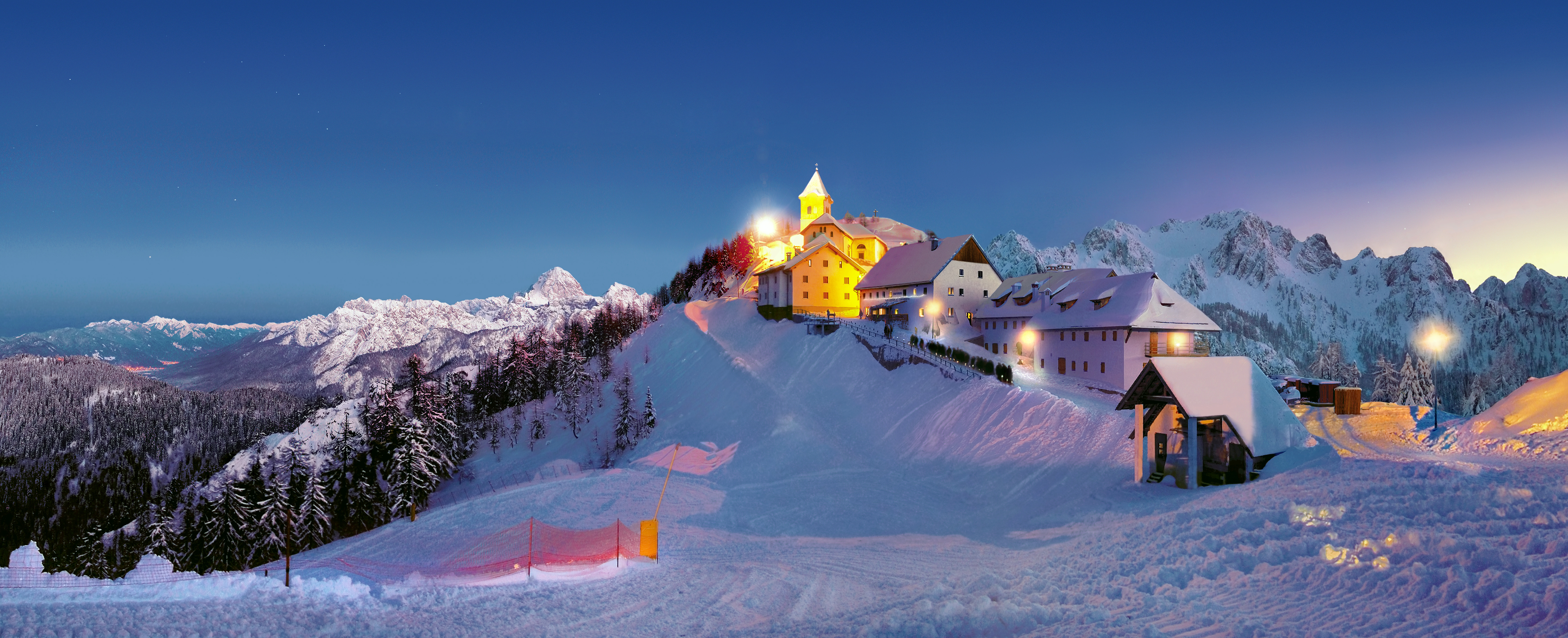 La Telecabina del Monte Lussari permette agli sciatori di misurarsi lungo l'elettrizzante pista Di Prampero e ai pedoni di salire fino in cima al borgo per cenare e godersi una serata speciale e romantica in quota.