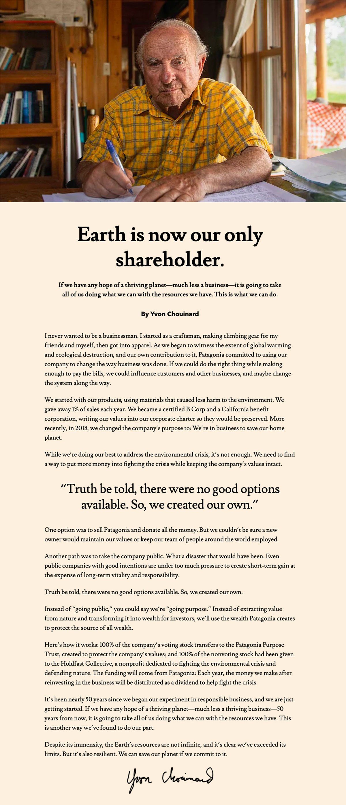 La scelta del cambiamenteo epocale viene descritta direttamente dall'eccentrico scalatore in una lettera pubblicata sui social network e sulla homepage del sito internet patagonia.com: «La Terra è ora il nostro unico azionista». Un patrimonio devoluto per combattere la crisi climatica.