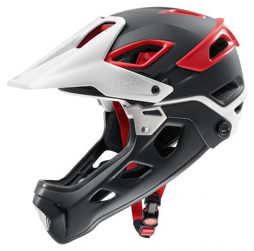 Un casco integrale in purissimo stile competizioni enduro, ma anche un comodo modello half shell, "mezzo guscio". In salita, quando non si necessita della protezione integrale, la mentoniera può essere rimossa senza nessun attrezzo in non più di dieci secondi e si può di nuovo montare velocemente e facilmente prima di una discesa a rotta di collo. Il peso è di soli 630 grammi di peso! Il cavo metallico Boa e la manopola a 360 gradi assicurano sempre il giusto adattamento e stabilità del casco ed è presente il solito sistema IAS Uvex di regolazione. Vi sono 14 aperture di ventilazione e, per quanto riguarda l’allacciatura, ci sono anche qui il sistema Uvex Monomatic, che non permette l’apertura accidentale, e la cinghia regolabile con tecnologia Fast-Adapting-System. Nella visiera si trova il portaocchiali integrato che permette un’esperienza full face ma, quando le lenti non servono, si possono far scivolare sotto alla visiera.