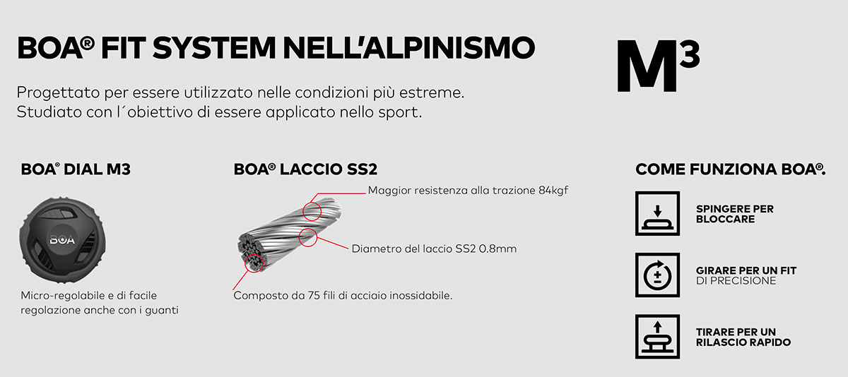 BOA è presente nell’alpinismo dal 2011. In questi dieci anni l'azienda fondata nel 2001 da Gary Hammerslag ha visto incrementare sempre di più il numero di brand che hanno deciso di equipaggiare i loro scarponi da Touring con la caratteristica chiusura a rotella. Scarpa è stata la prima azienda a crederci, seguita da Fischer, Atomic ed oggi anche La Sportiva e Salomon.