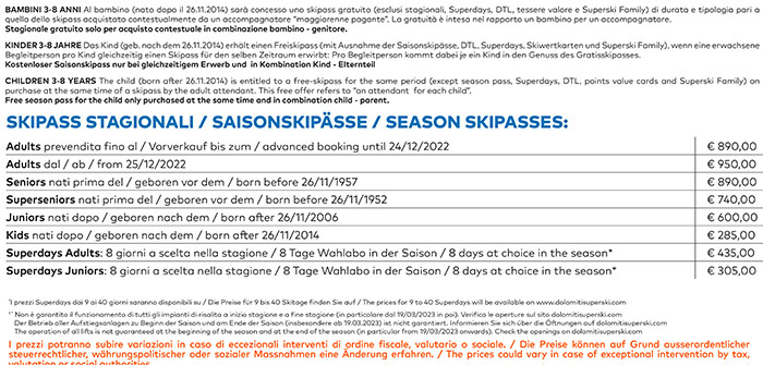 Skipass Dolomiti Superski 2022/2023